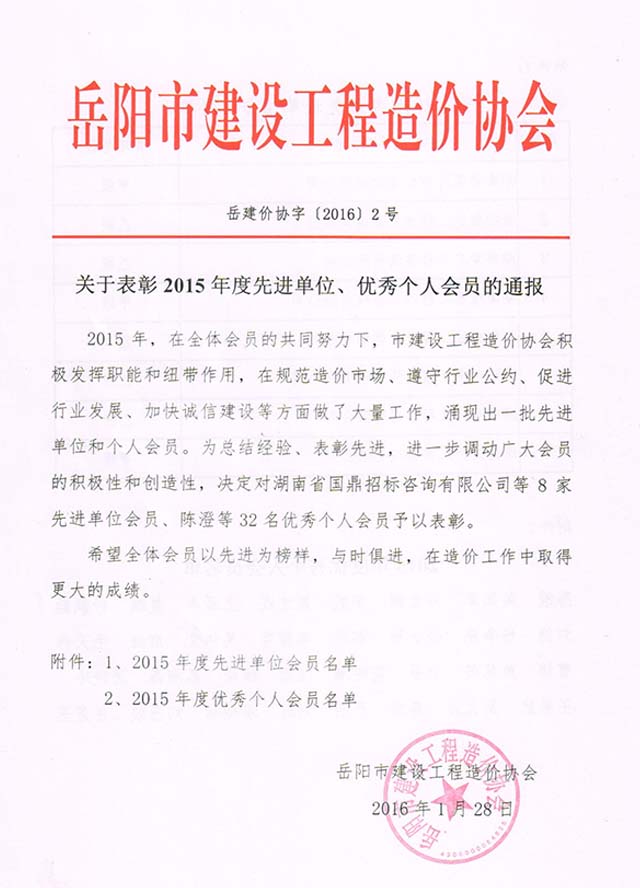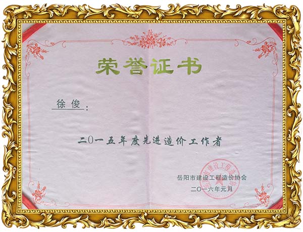 我公司榮獲2015年度岳陽市工程造價協(xié)會先進單位榮譽,同時徐俊,倪娟榮獲岳陽市造價協(xié)會2015年度優(yōu)秀個人榮譽。